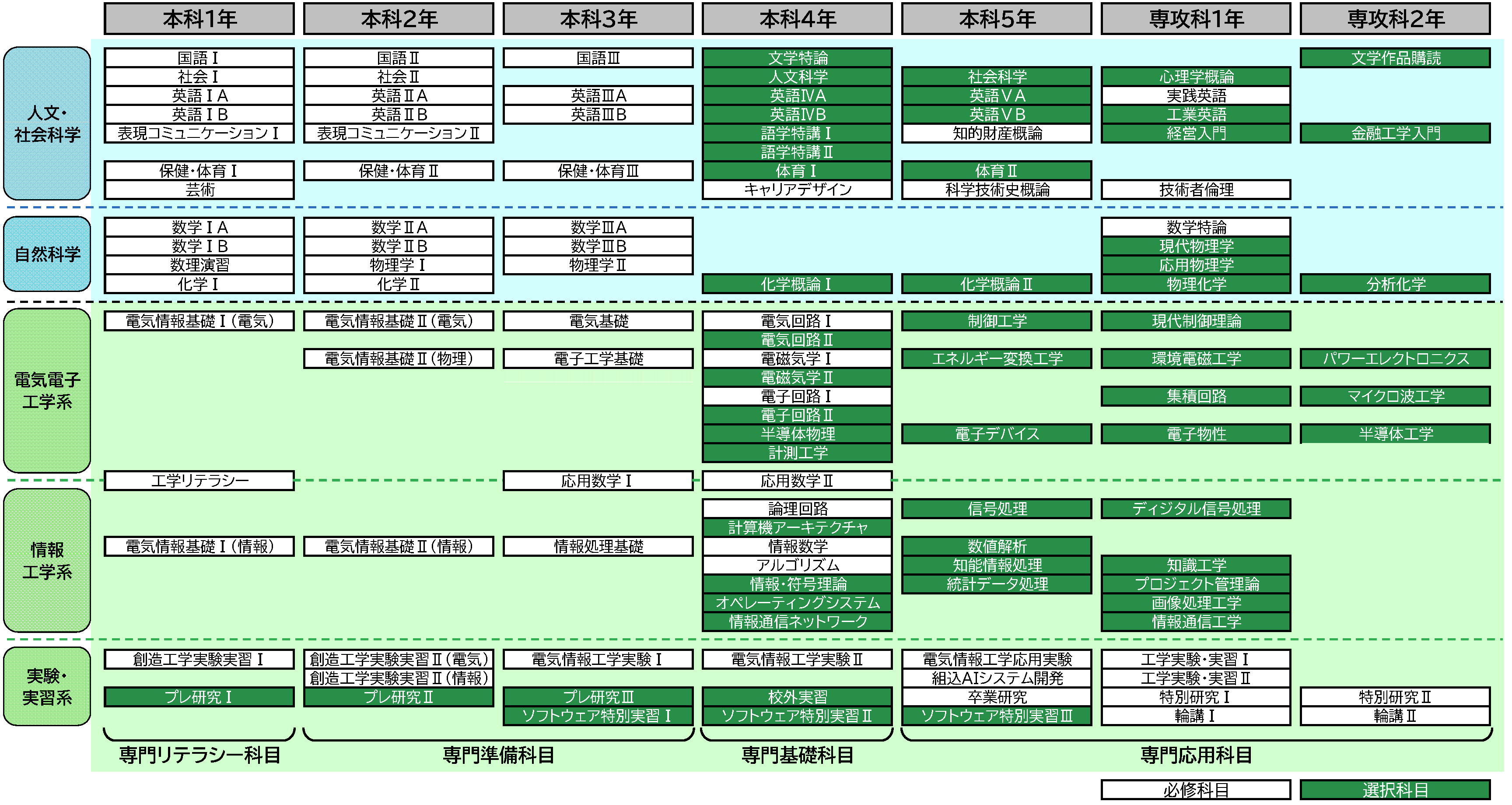 電気情報工学科では、下図に示すカリキュラム構成により、電気・電子・情報の3分野に広く精通した人材の育成を実施しています(画像はクリックで拡大できます)。