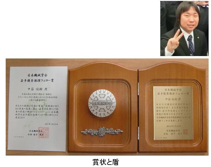 平成25年3月8日に高知工科大で開催された日本機械学会 中国四国支部 第51期総会・講演会において当時・専攻科2年(現・京都大学大学院)の 中筋俊樹君が下記題目で講演し,この度,「若手優秀講演フェロー賞」を受賞しました.これは,講演内容が有益で新規性があり,発表の態度に優れ た若手研究者に贈られるものです.中筋君の今後の活躍が期待されます.