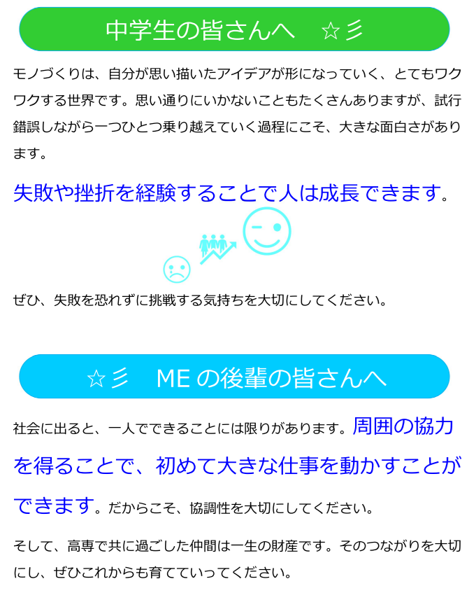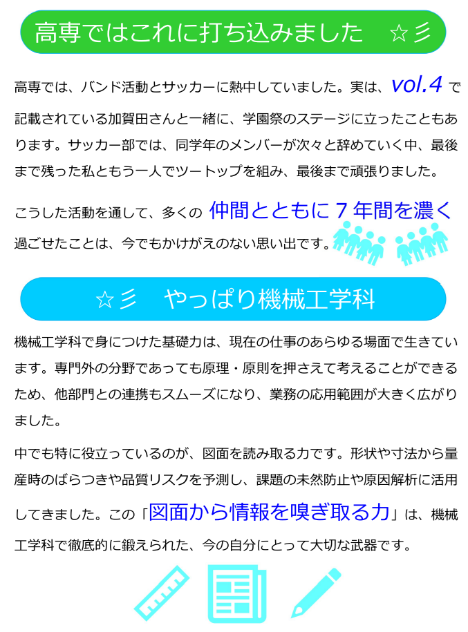 田中さん,中内さん両名は昨年3月に修了(学士を取得)しており,現在は,機械工学科や専攻科機械コースでの学習・研究経験を活かしてエンジニアとして活躍しています。