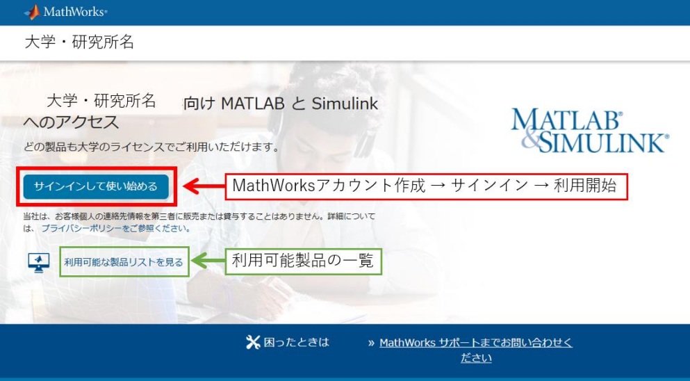 MathWorks社のサポート問合せページ:技術面のサポートはこちら。