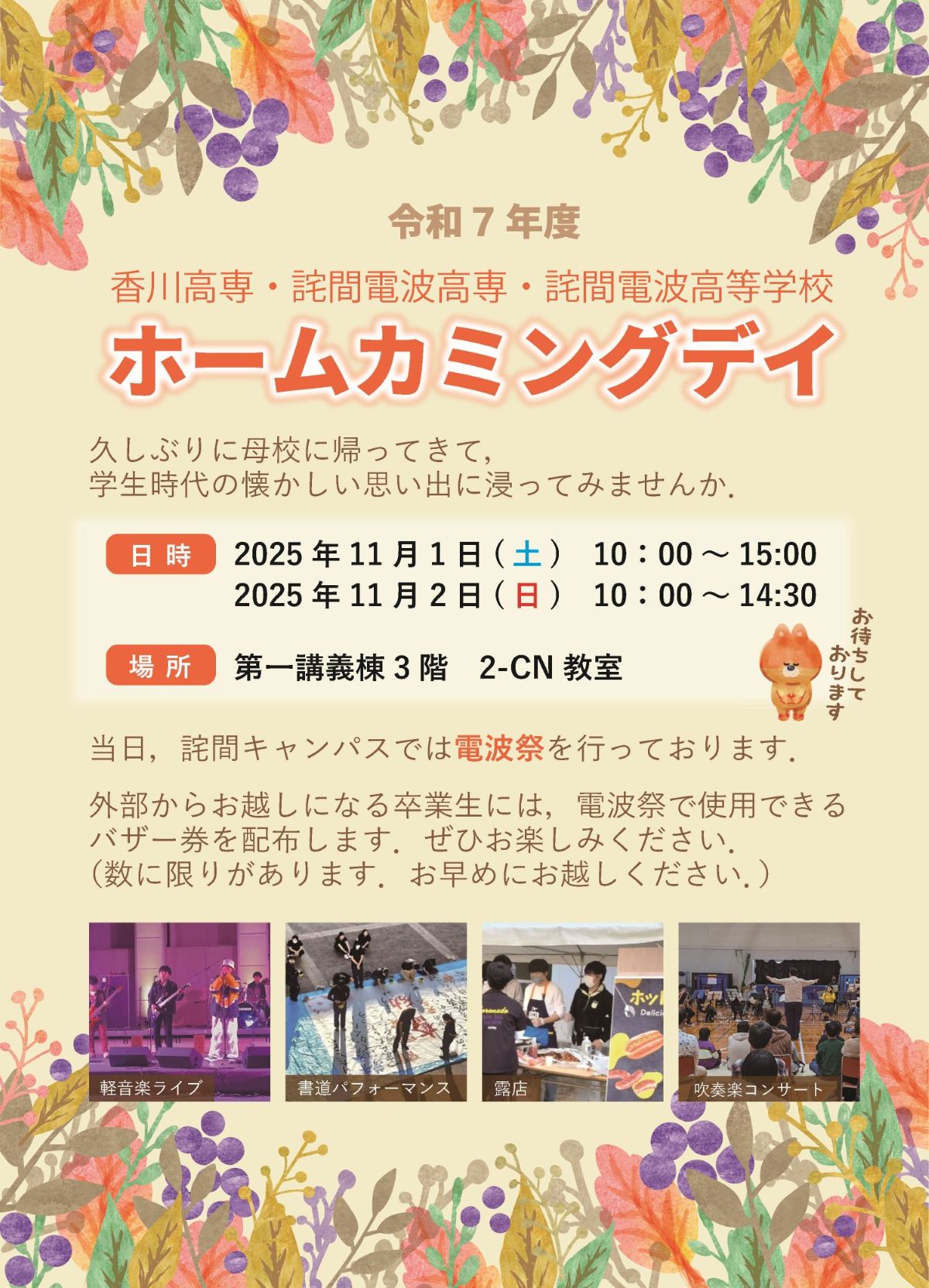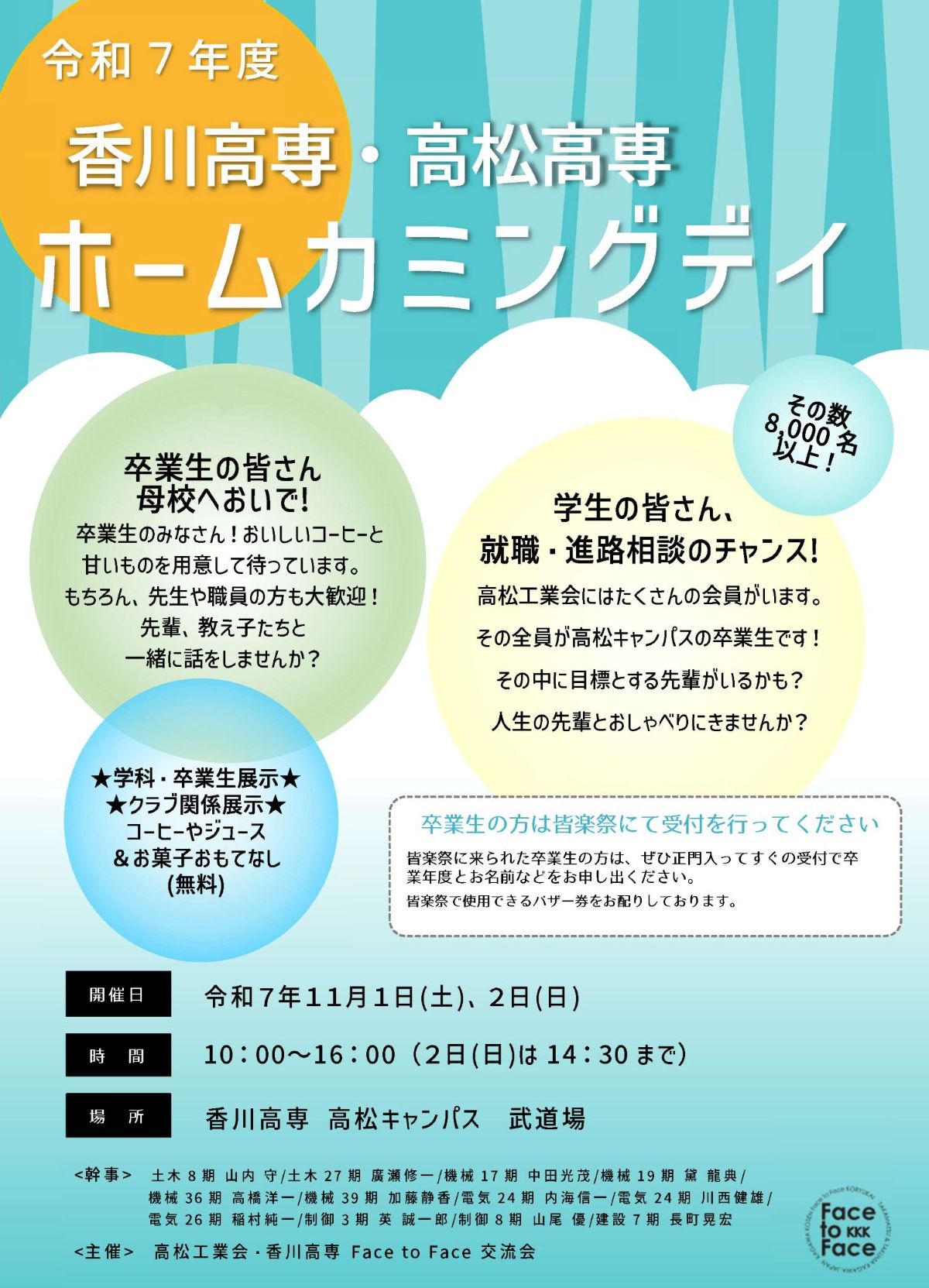 卒業生の皆様同士の旧交を温めていただくことを目的として、ホームカミングデイを同窓会(高松:高松工業会、詫間:七宝会)のご協力のもとに学生祭と同時開催します。