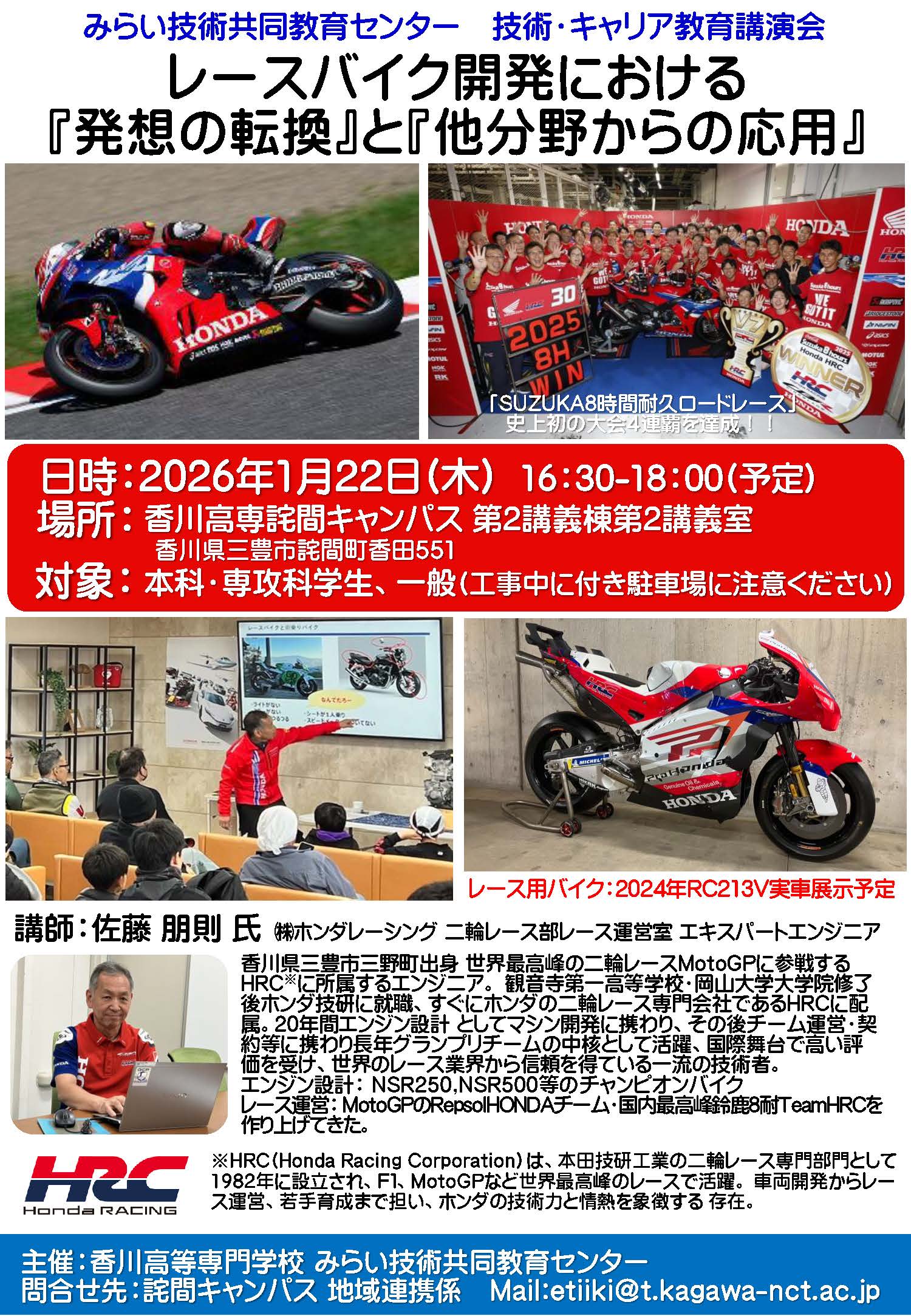 レースバイク開発における「発想の転換」と「他分野からの応用」と題し、三豊市三野町出身の株式会社ホンダレーシング 二輪レース部レース運営室 エキスパートエンジニアの佐藤 朋則氏にご講演頂きます。