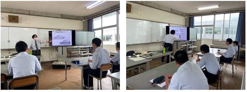 令和7年9月29日(月)午前に多度津高校にて,昨年度に引き続き香川県造船教育推進協議会の出前外部講師派遣事業出前講座を実施しました。本年度は多度津高校2年機械科造船コース5名の生徒さんにご参加いただきました。当校からは機械工学科の徳田が担当講師として参加し,学校で習った数学や物理を船体の運動に当てはめ,船体に加わる力と運動の関係や,どのように造船設計に生かされるかを解説しました。参加した生徒さんも非常に熱心に聴講しており有意義な時間を過ごすことができました。(なお,講習内容は担当講師が共著した「海文堂 船に学ぶ基礎力学 商船高専キャリア教育研究会編」の内容の一部となります)。