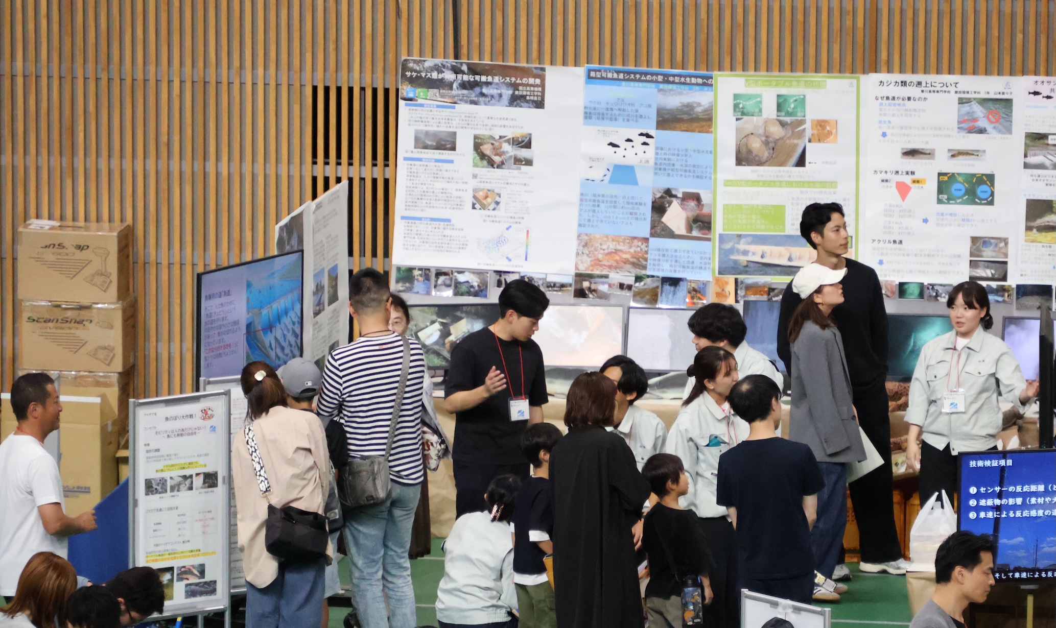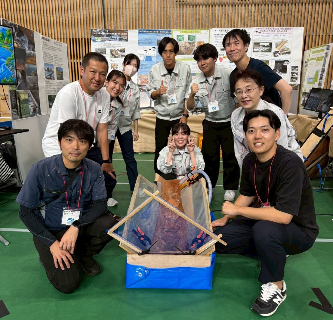 高橋研究室では、一般市民が使用できる安価かつ高性能な可搬式の魚道*を開発し、地域と連携して運用することで、河川構造物によって水生動物が移動困難になった現場の環境改善に取り組んでいます。今回のアイデアコンテストでは、志を同じくするトヨタ技術会のスタッフと、産学連携により可搬魚道技術を発展させる案を展示しました。