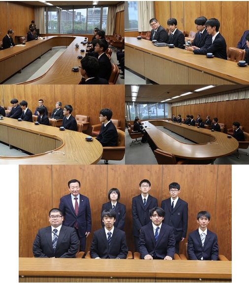表敬訪問では、大西市長から大会を経験しての感想や苦労した点、ロボットの構造や製作における役割分担などについて質問があり、学生たちはこれまでの取り組みを振り返りながら説明しました。また、大会での成果や感想、全国大会出場に向けた意気込みについても報告し、大西市長から「全国大会でのさらなる活躍を期待しています」と激励の言葉をいただきました。