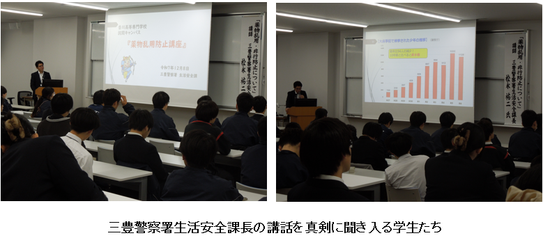 令和7年12月8日(月)に、第2学年の学生を対象に、香川県三豊警察署生活安全課長を講師に招いて、「薬物乱用・非行防止について」の講話を実施しました。