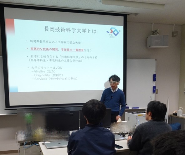 2025年12月17日に,長岡技術科学大学の野村収作先生や本校専攻科出身の技術職員,専攻科2年生,情報工学科5年生が情報工学科の4年生に向けて,進学・就職に関するキャリアトークを実施しました。野村先生からは長岡技術科学大学について詳細な説明がありました。進学者からは,東京農工大学,徳島大学への合格体験や,受験勉強の時期や方法,専攻科の良いところについてのプレゼンが行われました。就職者からは,企業の選び方,就職活動の内容,SPIに関するプレゼンがありました。また,質疑応答の時間には4年生から積極的な質問が寄せられ,活発なやりとりが見られました。