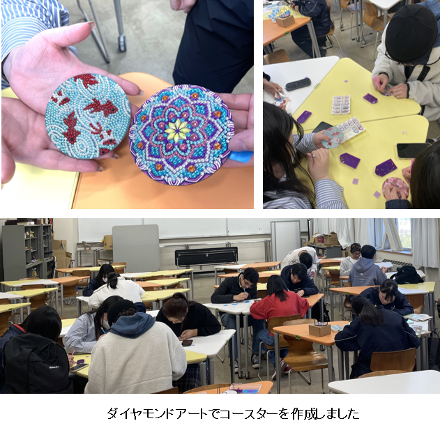 参加した学生たちは、コースターの柄を相談したり、作り方を教え合ったりしながら作成に取り組みました。最後は完成したコースターをお互いに披露して、交流を深めていました。