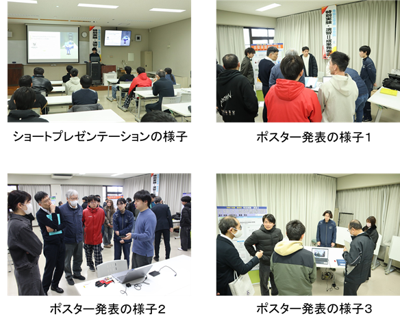 1月23日(金)13:20~15:00、専攻科2年生の特別実験・演習Ⅱ成果発表会を行ないました。ショートプレゼンテーションの後、ポスター形式で発表しました。特別実験・演習Ⅱは、学生がチームを編成し、チームで課題を設定し、問題解決をしながら課題を達成するデザイン教育を実施しています。今年度は、4つのチームに分かれて実施しました。発表会には、多くの教職員、一般学生も参加しました。製作物に対するアイデアや工夫点を発表し、参加者との活発な意見交換を行ないました。