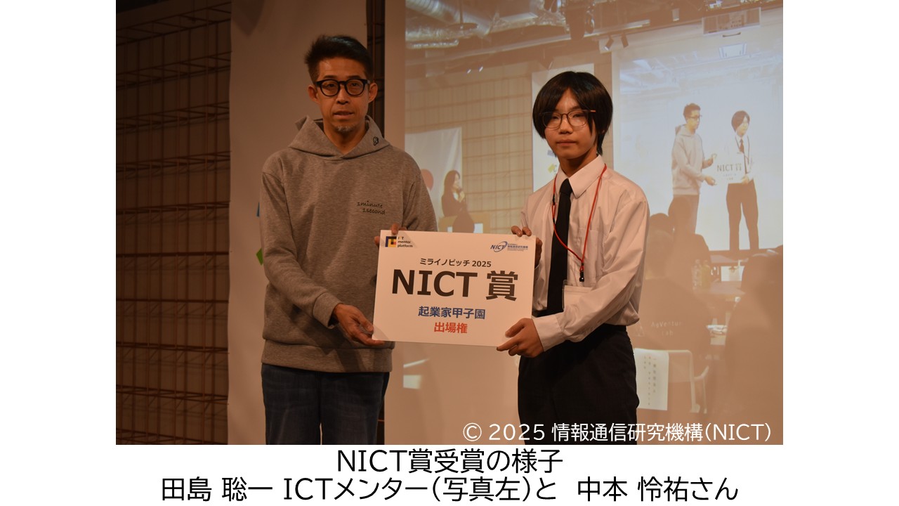 中本さんは,「「隣の高専生」〜高専生と地域をつなぐ課題解決プラットフォーム〜」というテーマで発表を行いました。「隣の高専生」は,高専生の実践的な技術力と地域・スタートアップが抱える課題を結びつける課題解決プラットフォームで,全国の高専生や卒業生同士の協働や交流を促進し,学業・就職・起業につながる実務経験を得ながら成長できる新しいキャリア形成の場を目指するソリューションとなっています。高専生ならではの視点とICTを活用した地域課題へのアプローチが高く評価され,NICT賞の受賞となりました。同賞の受賞により,中本さんは起業家甲子園の出場権を獲得しました。