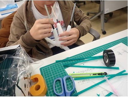 本講座は身近なものを作った楽器作りを通して, 科学やものづくりに興味を持ってもらおうという試みです。参加者は簡単な講義の後に, ストローとゴム手袋を作った簡易的な「バグパイプ」作りに挑戦しました。安定して音が出るようにリード部分を作成したり, 音程を調整するのは大人でもなかなか難しいのですが, 2人とも試行錯誤しながら熱心に取り組み, 空気を手袋にためて, リードで複数の音を出す「簡易バグパイプ」を作成することができました。