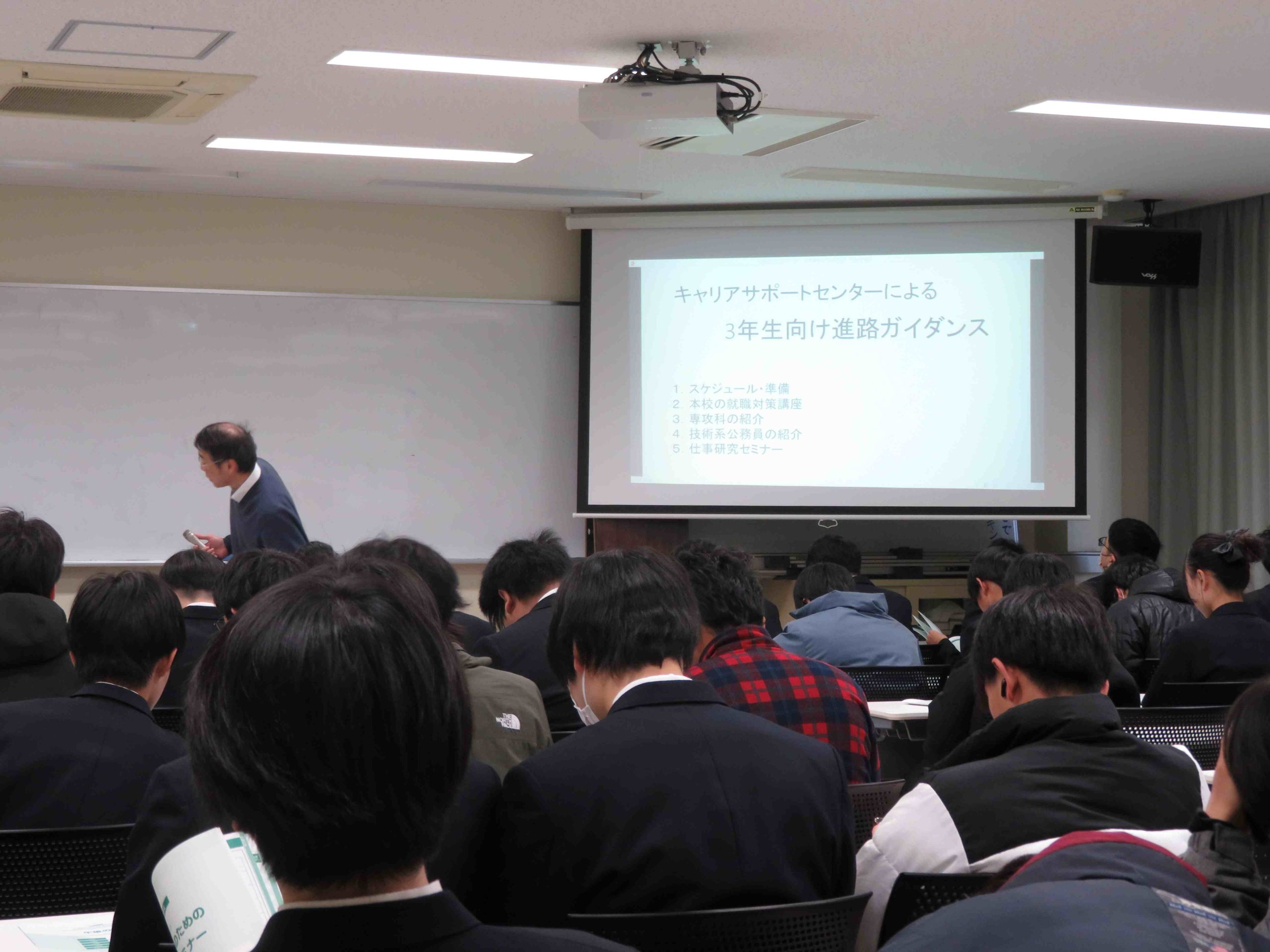 令和8年2月17日(火)3年生向け進路ガイダンスを実施致しました。4年生の前期にインターンシップが控えており、この時期から自身のキャリアについて考え始めておくことは、非常に大切です。2月19日実施の仕事研究セミナーの午後の部に三年生は参加となっておりますので、実施前に自身のキャリアについて考えるきっかけとしてもらいたいという思いで、ガイダンスを実施いたしました。
