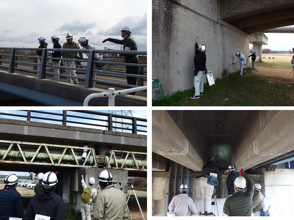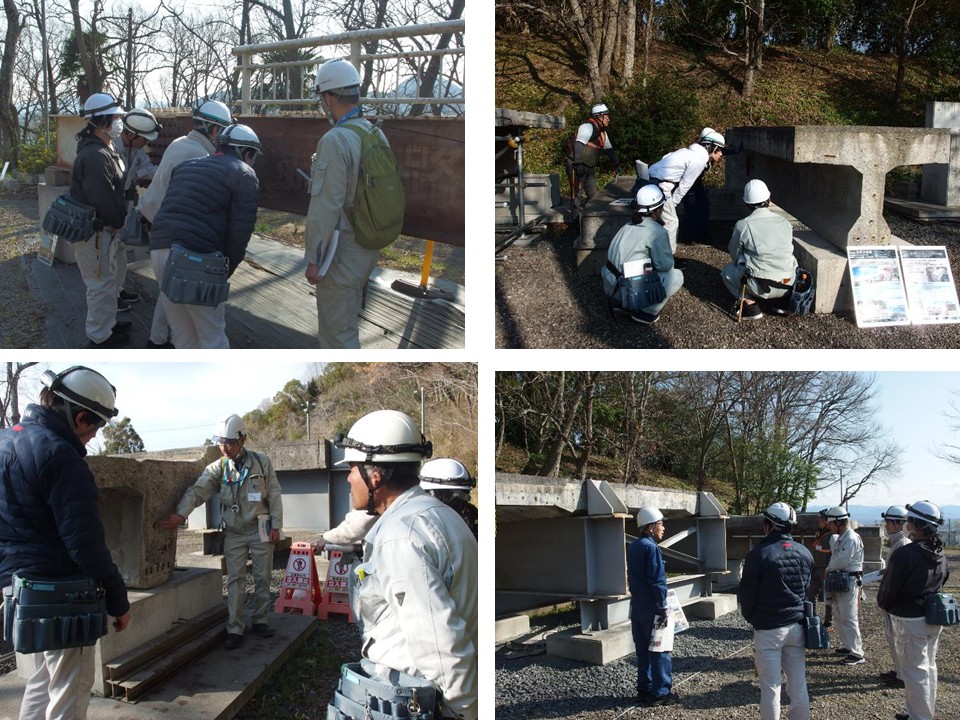 この講習会は実橋や実教材を用いた実践的な内容で構成されているのが特徴です。春を感じる日差しでしたが、気温はまだまだ低い中みなさん熱心に橋梁点検実習に取り組まれていました。現場での実橋を見ながらの説明は、理解が深まったと受講者の皆さんから好評でした。