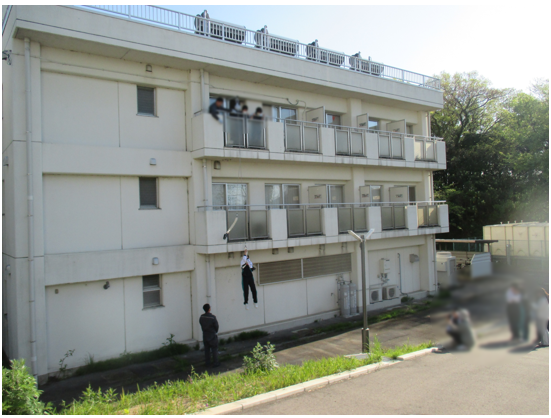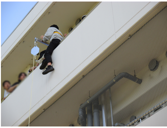 四国メインテナンス株式会社の担当者をお招きし、実際に器具を取り付けて降下を体験しました。短期派遣留学生を含め寮生一人ひとりが迅速な対応を行い、安全に避難ができるように防災意識の高揚を図ることができました。