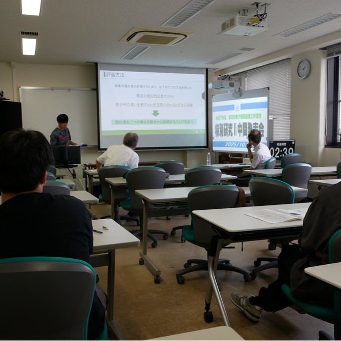 - 電子情報通信工学専攻において、特別研究Ⅱ中間発表会を行ないました
